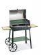 Barbecue con: doppio braciere, griglia cromata, cassetto per la cenere, lamiera in acciaio verniciato, gambe smontabili, coperchio inox, ruote e mensole.