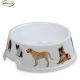 Ciotola rotonda in plastica per cani, bianca con decori.