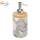 Dispenser portasapone in ceramica e bamboo colore bianco con disegno foglie nere altezza 18 diametro 7,5 centimetri