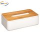 Cofanetto porta salviettine in plastica bianca con coperchio in bamboo.
