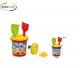 Secchio in plastica con innaffiatoio, rastrello, pala e formina castello.