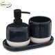 Set 3 pezzi bagno in ceramica colore ottanio con base bianca ,con dispenser portasapone altezza 14 diametro 9 centimetri,portaspazzolini altezza 9 diametro 8 centimetri, e vassoio altezza 3x21x11 centimetri