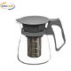 Teiera in vetro trasparente e manico di colore grigio in plastica con filtro in acciaio.